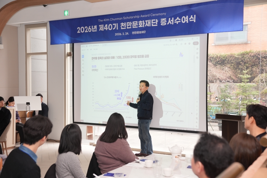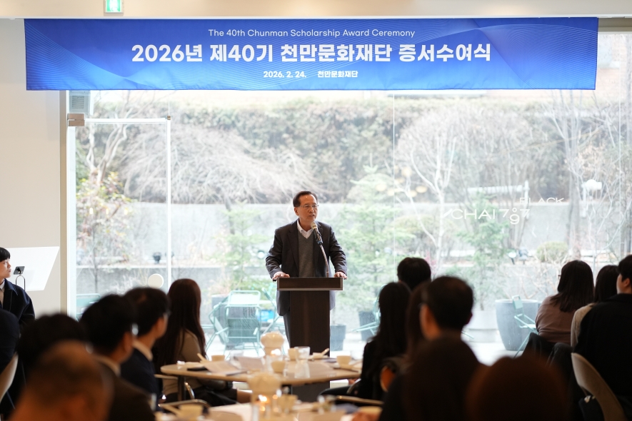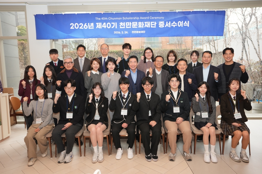 천만문화재단이 24일 제40기 장학증서 수여식을 열고 고등학생 20명과 대학생 200명 등 총 220여 명에게 장학증서를 전달했다. 재단은 올해 총 10억 원 규모의 장학금을 지원하며 미래 인재들의 성장을 지속적으로 뒷받침할 계획이다.